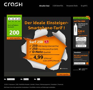 • 08.09.14 Im Rahmen des Preiskampfes unter den Handydiscountern buhlen die Anbieter fleißig um die Gunst der Kunden. So gibt es nun aktuell bei Crash einen Vodafone Smartphone Tarif für günstige 4,99 Euro statt 9,99 Euro. Allerdings gibt es nur 250 Tarifpakete, daher sollte man schnell sein.