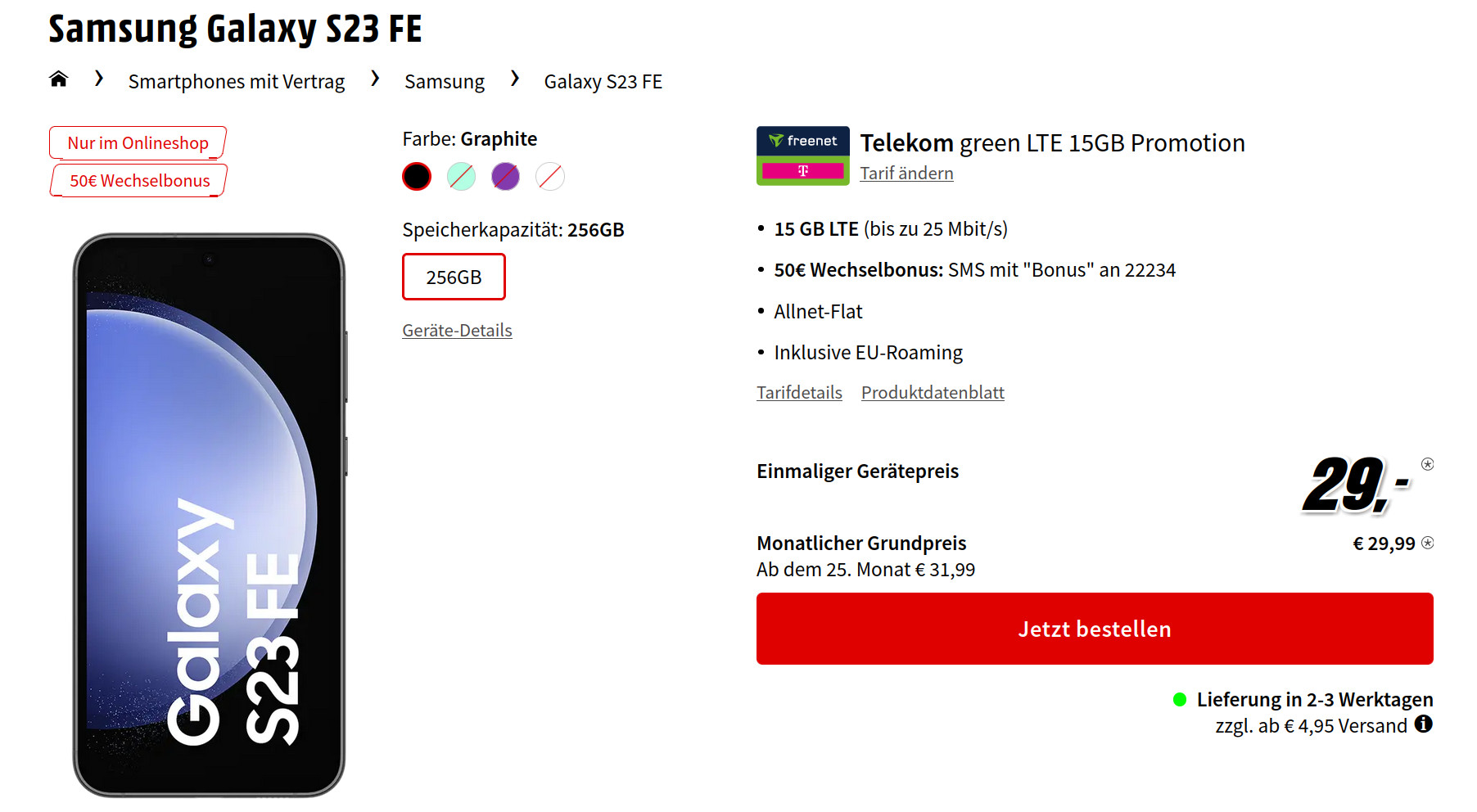Galaxy S23 FE Tarife: 15 GB Telekom Allnet-Flat für 29,99 Euro/Eff. 9,53 Euro --Screenshot: Mediamarkt |