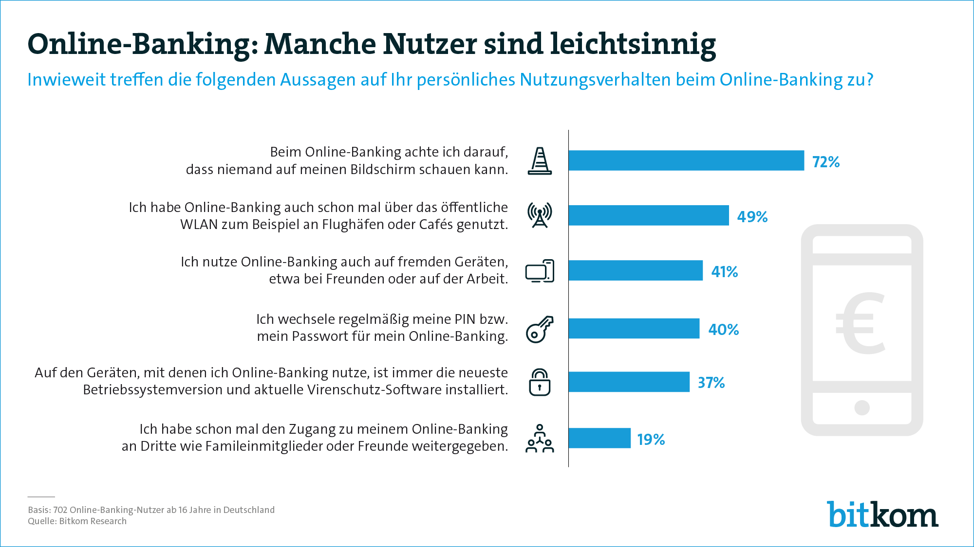 So sagen 72 Prozent der Online-Banking-Nutzer, dass sie beim Online-Banking darauf achten, dass niemand auf den Bildschirm schauen kann, aber jeder Vierte kümmert sich nicht darum. 49 Prozent nutzen Online-Banking zumindest hin und wieder über öffentliches WLAN, etwa auf Flughäfen oder in Cafés. Und 41 Prozent erledigen Online-Bank-Geschäfte auch mal mit fremden Geräten, etwa auf der Arbeit oder bei Freunden. Jeder Fünfte hat seine Zugangsdaten für das Online-Banking ein- oder mehrmals an Dritte wie Familienmitglieder oder Freunde weitergegeben.