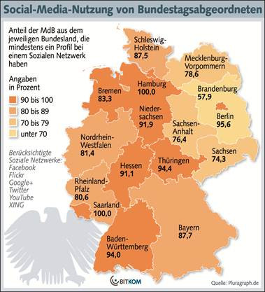 Sehr beliebt bei den Bundestagsabgeordneten ist die Nutzung von Facebook. Die meisten Facebook-Profile haben die politischen Vertreter aus dem Saarland mit 100 Prozent, Thüringen (94 Prozent) und Hamburg (92 Prozent). Der Kurznachrichtendienst Twitter ist ähnlich weit verbreitet. Besonders aktive Twitterer kommen aus Berlin mit 83 Prozent, Hamburg (77 Prozent) und Sachsen-Anhalt (76 Prozent).