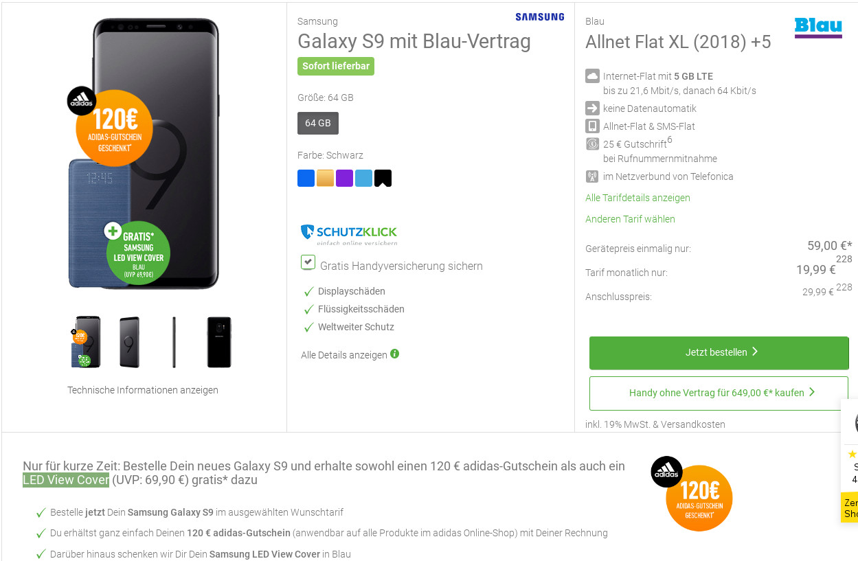 Preisknaller: 120 Euro adidas Gutschein plus Galaxy S9 mit 5 GB Blau All-In-Flat für mtl. 19,99 Euro/Eff. -4,18 Euro