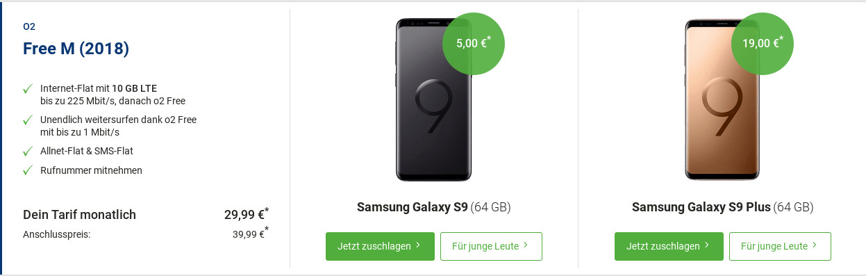• 14.03.19 Weiterhin haben wir jede Menge Preistipps mit dem Galaxy S9 in den Online-Shops. So gibt es das Samsung Galaxy S9 im Wert von 480 Euro weiterhin mit einer 10 GB All-In-Flatrate für monatliche 29,99 Euro mit einem Highspeed Tarif von 225 Mbit/s im schnellen O2 Netz. Ferner kann man hier auch die Rufnummer mitnehmen. Damit wird die Tarifaktion aus dem Vormonat verlängert. Wir zeigen Ihnen, wie immer, alle Tarifeigenschaften bei der neuen Galaxy S9 Tarife Aktion auf.