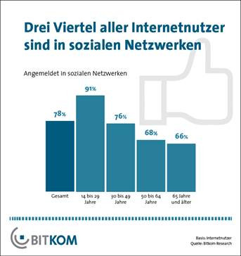 "Die digitale Kluft zwischen den Generationen nimmt in Sozialen Netzwerken deutlich ab. Soziale Netzwerke sind über alle Alters- und Themengrenzen hinweg zu einer relevanten Kommunikationsplattform geworden.", sagt BITKOM-Präsident Prof. Dieter Kempf. Zwischen den Geschlechtern gibt es im Übrigen keine Unterschiede. 78 Prozent der männlichen Internetnutzer sind bei mindestens einem sozialen Netzwerk angemeldet. Bei den Frauen sind es 77 Prozent.