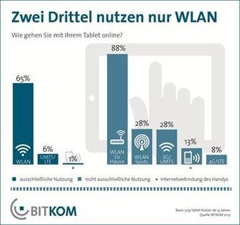 • 28.08.13 Die Tablet PCs haben von zuhause aus schon einen WLAN Anschluss, ein UMTS oder LTE Mobilfunkzugang ist oftmals nur gegen Aufpreis erhältlich. Daher verwundert es nicht, dass die Tablet Computer oftmals nur Zugriff auf das WLAN haben.Immerhin gibt es nun eine Bestätigung in Zahlen. Laut dem Branchenverband
