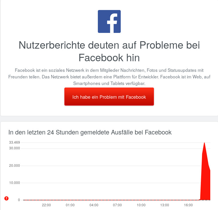 So sind die ersten grossflächigen Störungen um rund 17.30 Uhr aufgetreten. So vermelden bei Allesstörungen in der Spitze bis zu 150.000 Whatsapp Nutzer eine Störung, bei Facebook sind es es rund 34.000 Störungen und bei Instagram sind es 52.000 Störungen.