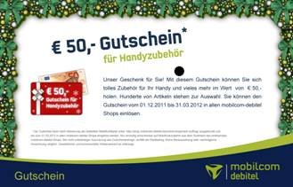• 12.12.11 Bei dem Service-Provider mobilcom-debitel gibt es nun im Rahmen einer Weihnachtsaktion zum Wochenstart bis zum 31.Dezember einen 50 Euro Gutschein im mobilcom-debitel Online-Shop.Der Gutschein kann bei allen Produkten im Online-Shop eingesetzt werden. Der Gutschein kann auch in allen mobilcom-debitel Shops gegen Mobilfunkzubehör aus